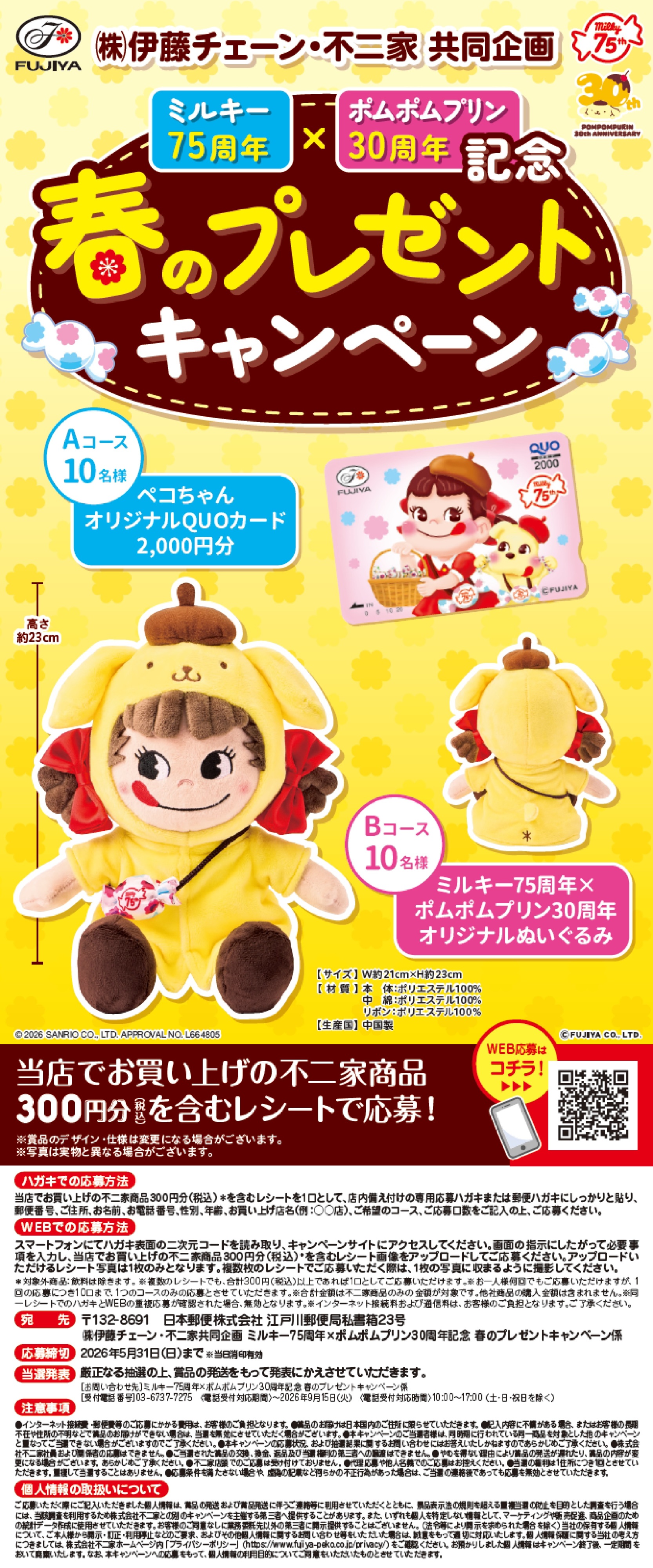・Bコース ミルキー75周年×ポムポムプリン30周年 オリジナルぬいぐるみ 10名様